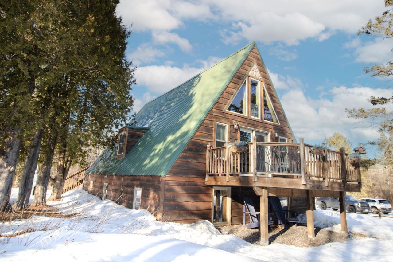 Stunning 3 bedroom, 2 bath, 4 huge decks, A frame wood home on 12+ acres! Everything updated with quality and thoughtfulness. Six Great Lakes Windows drench the front of the house with sunshine! Two picture windows light up the dining room! The loft upstairs is a perfect yoga or reading space! The gas fireplace in the great room adds to the coziness of the wood drenched walls. A metal roof ensures no problems for many years! The patio and landscaping is second to none. There are great trails behind the home for hours of 4 wheeling adventures or snowmobiling or hiking! Spring will come with beautiful perennials and bushes to enjoy. The garage is a dream! 4 car garage with heating, ceiling fan, 8'x16' door, fully insulated and ready for your storage or your projects.