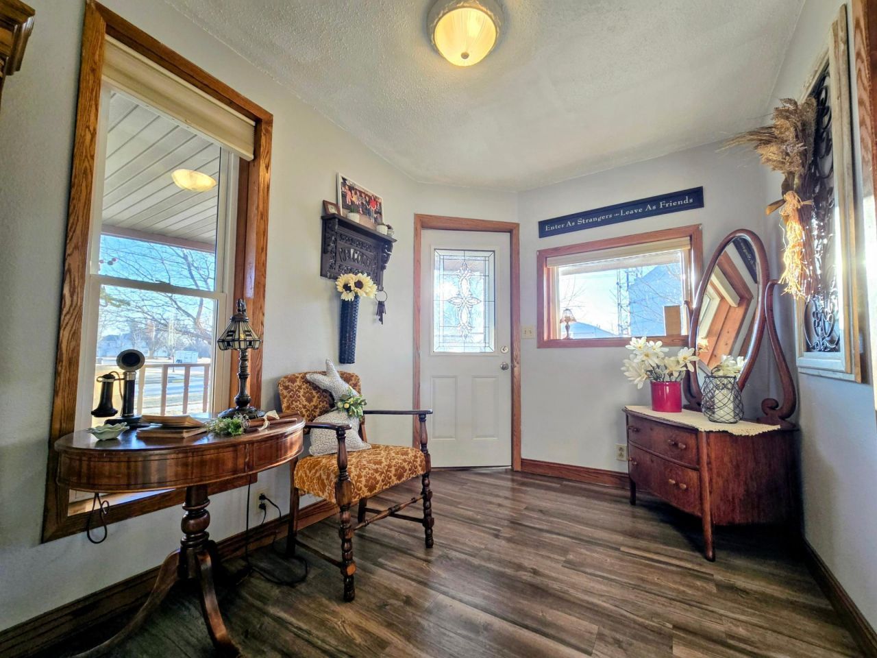 Spacious Two-Story Home with Wrap-Around Porch, Heated Garage & Beautifully Landscaped YardEnjoy space, character, and outdoor living in this spacious two-story home featuring a welcoming wrap-around porch, beautifully landscaped yard with fruit trees, and an impressive 28' x 40' heated and insulated garage with workshop area.The home offers a large foyer entry leading into a comfortable living room with built-in bookcases and bow windows that provide great natural light. The main floor also includes a formal dining room with bow window, oak kitchen with dining bar, convenient main-floor laundry, and a full bath. A rear mudroom connects the home to the attached garage and provides easy access to the backyard. Attractive vinyl plank flooring runs throughout much of the main level.The upper level features four bedrooms, including a primary bedroom with vaulted ceiling, bow window, 6' x 6' walk-in closet, and an updated bath with wide soaker tub, new vanity, and updated fixtures.Outdoor living is a highlight with a raised back deck, stamped concrete patio, and an 8' x 14' screened porch overlooking the beautifully landscaped backyard filled with fruit trees.The basement provides mechanical and storage space. Additional improvements include newer plumbing, updated electrical with 200-amp service, forced-air furnace (approximately 10 years old), central air, and two sump pumps.Additional storage includes a 5' x 16' shed with cement floor and a large 8' x 40' side shed with access on both ends.With generous living space, outstanding garage/shop area, and beautiful outdoor spaces, this property offers comfort, functionality, and room to enjoy.