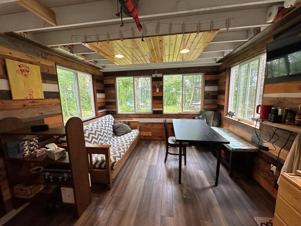 Enchanting tiny house perched right on the water's edge of Braaten Lake. Nestled in a serene lakefront setting, this cozy retreat sits on 2.44 acres and offers unparalleled tranquility and views. Braaten lake is a hidden gem with only a few cabins on the lake and opportunities to explore, swim, and canoe.The cabin sleeps 6 comfortably. Rain water is collected for washing and flushing in the detached bathroom with exterior shower. Enjoy the covered outdoor kitchen/dining space which is perfect for preparing meals on a griddle or over a campfire. The solar power has a back up generator. There is fiber internet on site and the power company can run power to the cabin. Propane heat. Cameras on site.